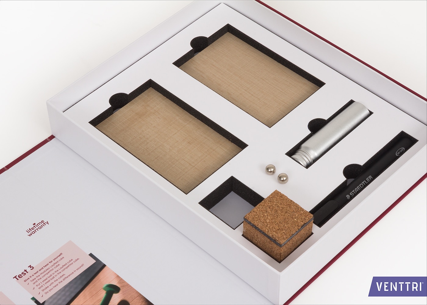 Im Inneren wurde ein Schaumstoff-Innenleben mit einer weißen Kartonabdeckung versehen. Dies verleiht der Innenseite eine luxuriöse Optik und hält die Muster und Produkte sicher an ihrem Platz. Der Schaumstoff ist passgenau gefräst, sodass der Inhalt ordentlich und sicher präsentiert wird.