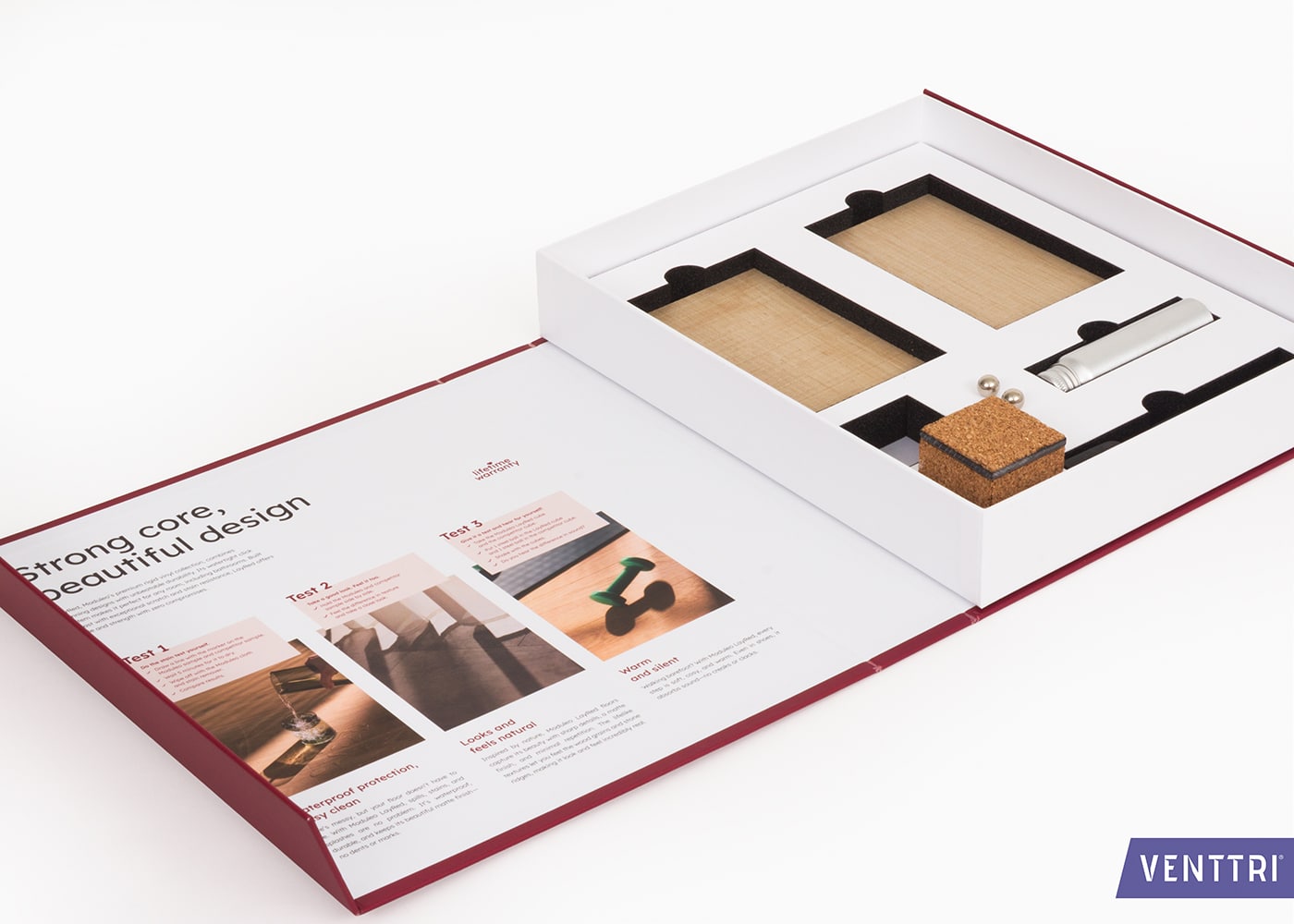 Für Moduleo haben wir eine stilvolle Präsentationsbox (Demo-Tool) entwickelt, die sowohl funktional als auch repräsentativ ist. Die Box ist vollständig mit Papier bezogen und verfügt über verdeckte Magnete, sodass der Verschluss sicher und unsichtbar integriert ist.