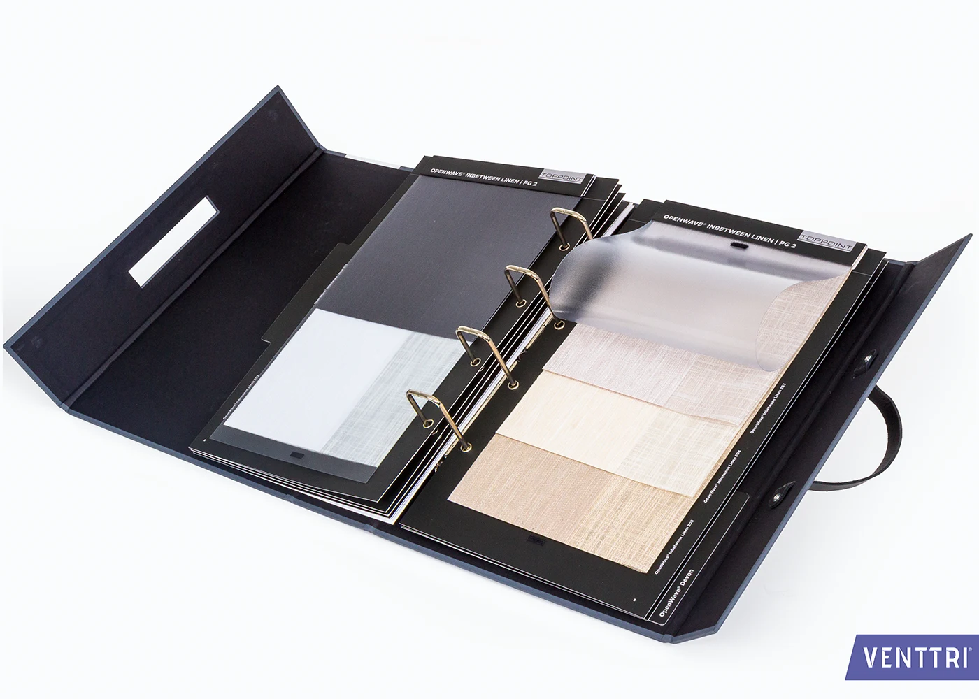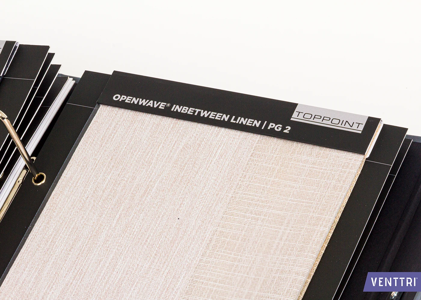 Für Toppoint entwickelte Venttri ein großes Gardinenmusterbuch, in dem Stoffmusterkappen mit Gardinenstoffen übersichtlich und stilvoll präsentiert werden. Eine maßgeschneiderte Präsentationslösung, die speziell dafür entwickelt wurde, Kollektionen auf eine luxuriöse und zugleich praktische Weise zu zeigen.
