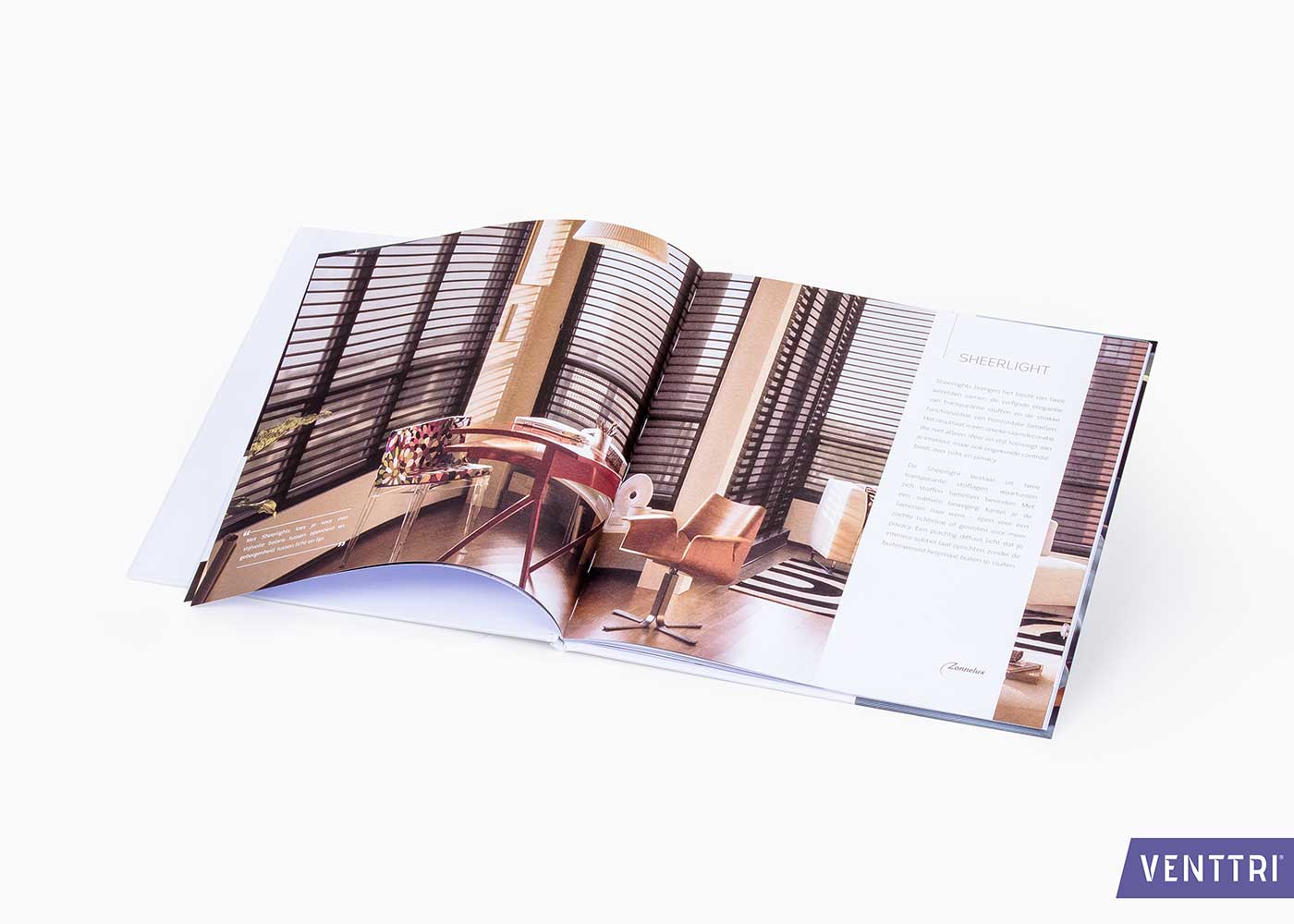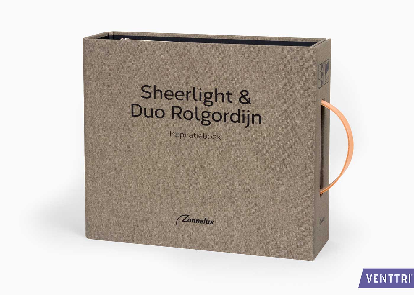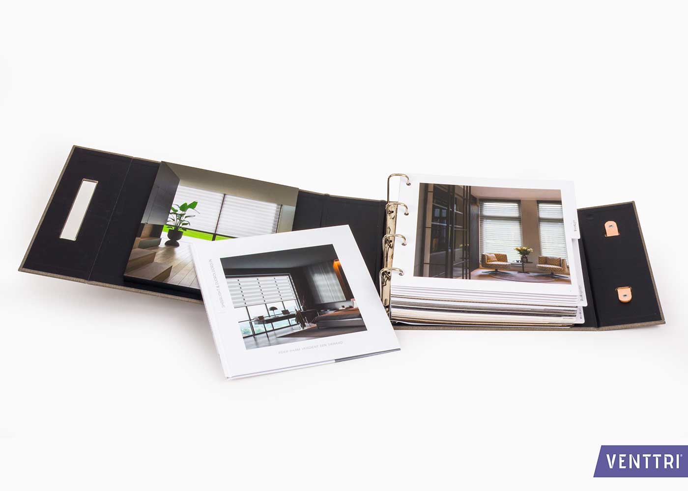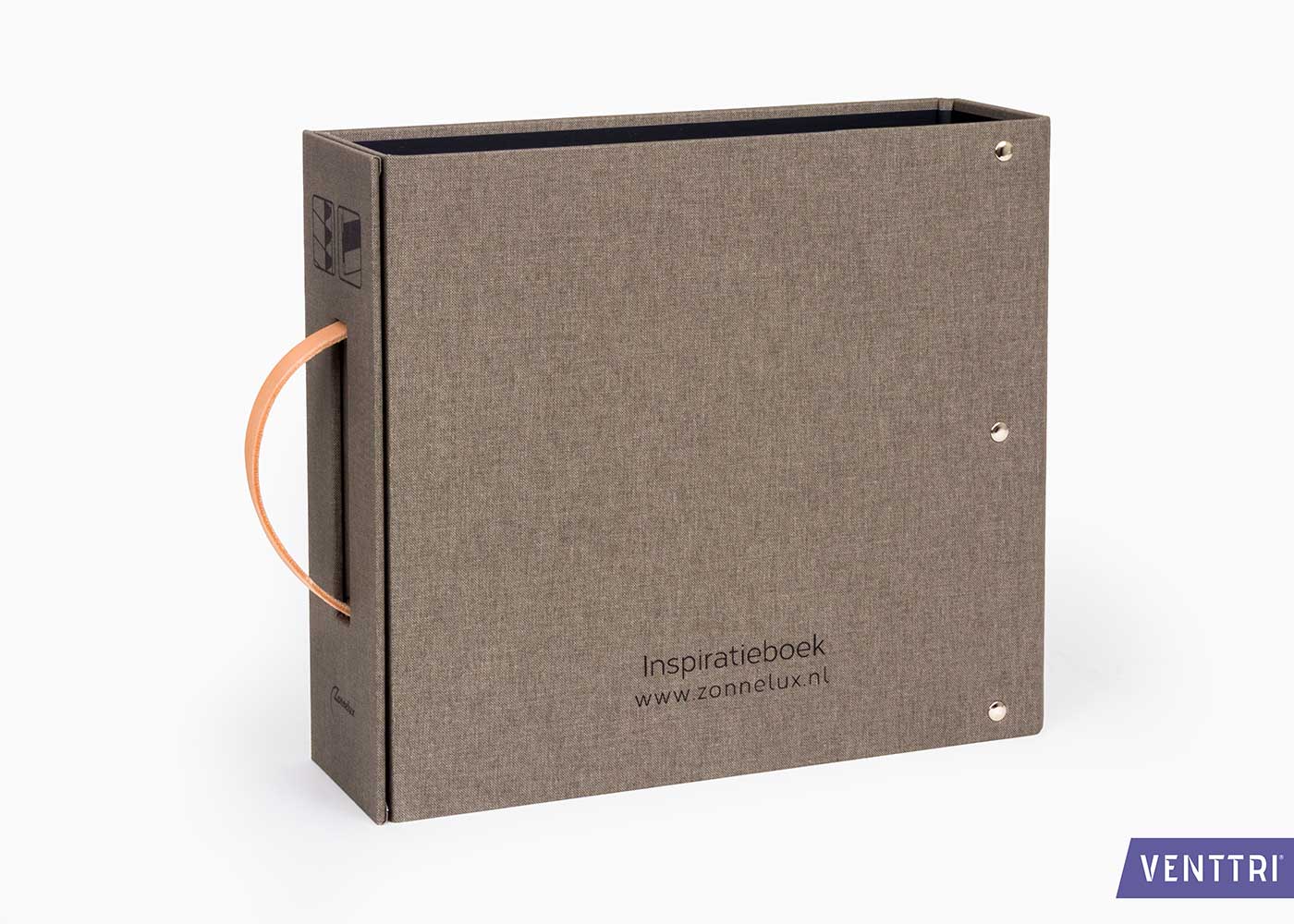 Für Zonnelux entwickelten wir ein robustes und stilvolles Inspirationsbuch, das nicht nur besonders langlebig ist, sondern auch eine exklusive Ausstrahlung hat. Die Mappe besteht aus 4 mm starkem Karton, vollständig mit Leinen überzogen und auf der Innenseite mit schwarzem Papier veredelt – für ein zeitloses und hochwertiges Gesamtbild.