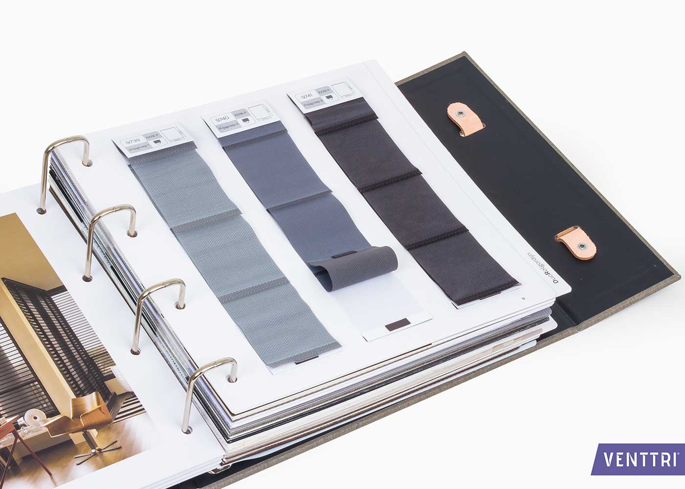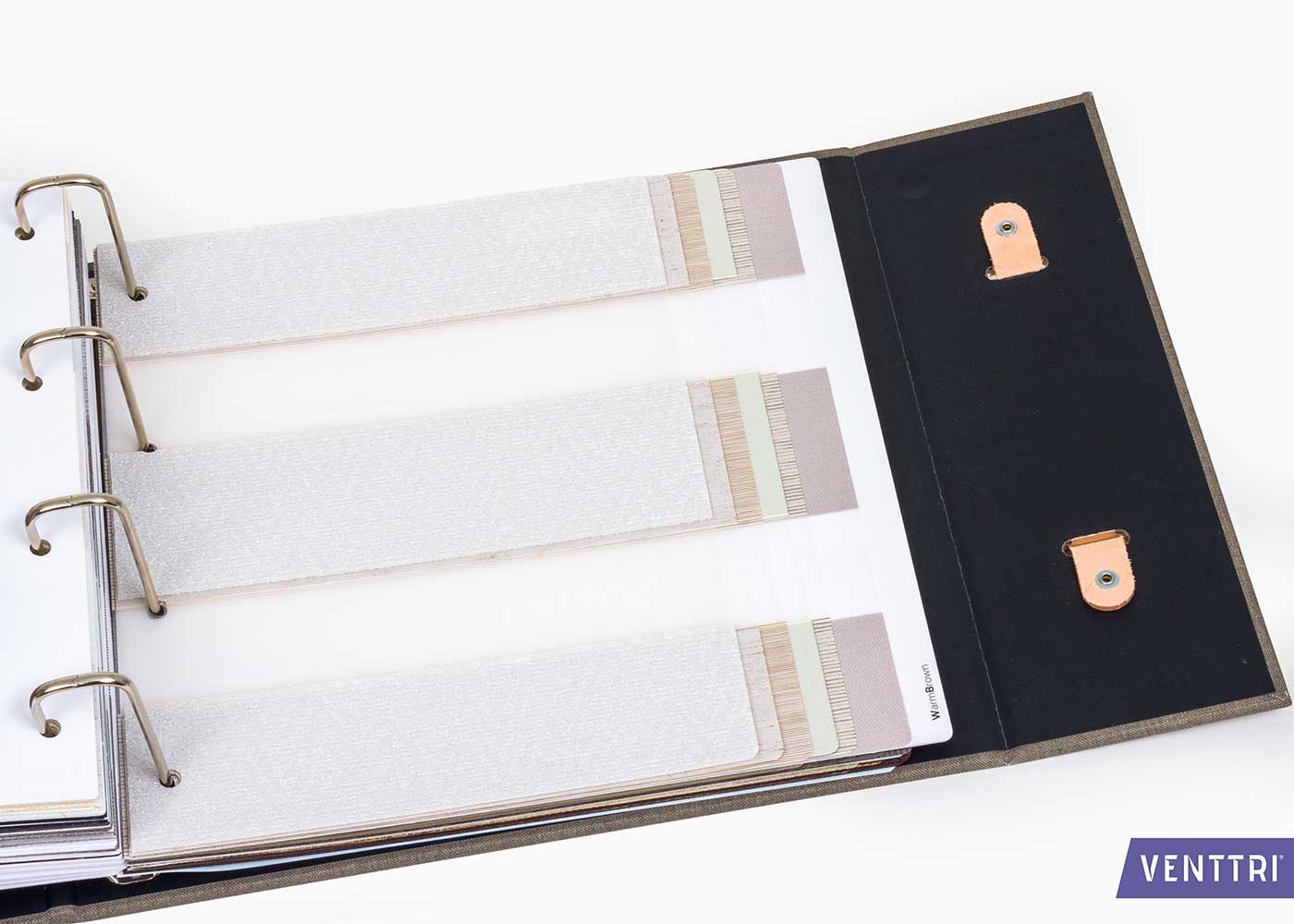 Bei Venttri sorgen wir dafür, dass alle Muster präzise auf Maß geschnitten werden, damit sie perfekt in das Präsentationsprodukt passen und ein einheitliches, hochwertiges Erscheinungsbild entsteht. Zudem enthält die Mappe integrierte Magnete, sodass alle Elemente sicher an ihrem Platz bleiben und bequem betrachtet werden können, ohne zu verrutschen.