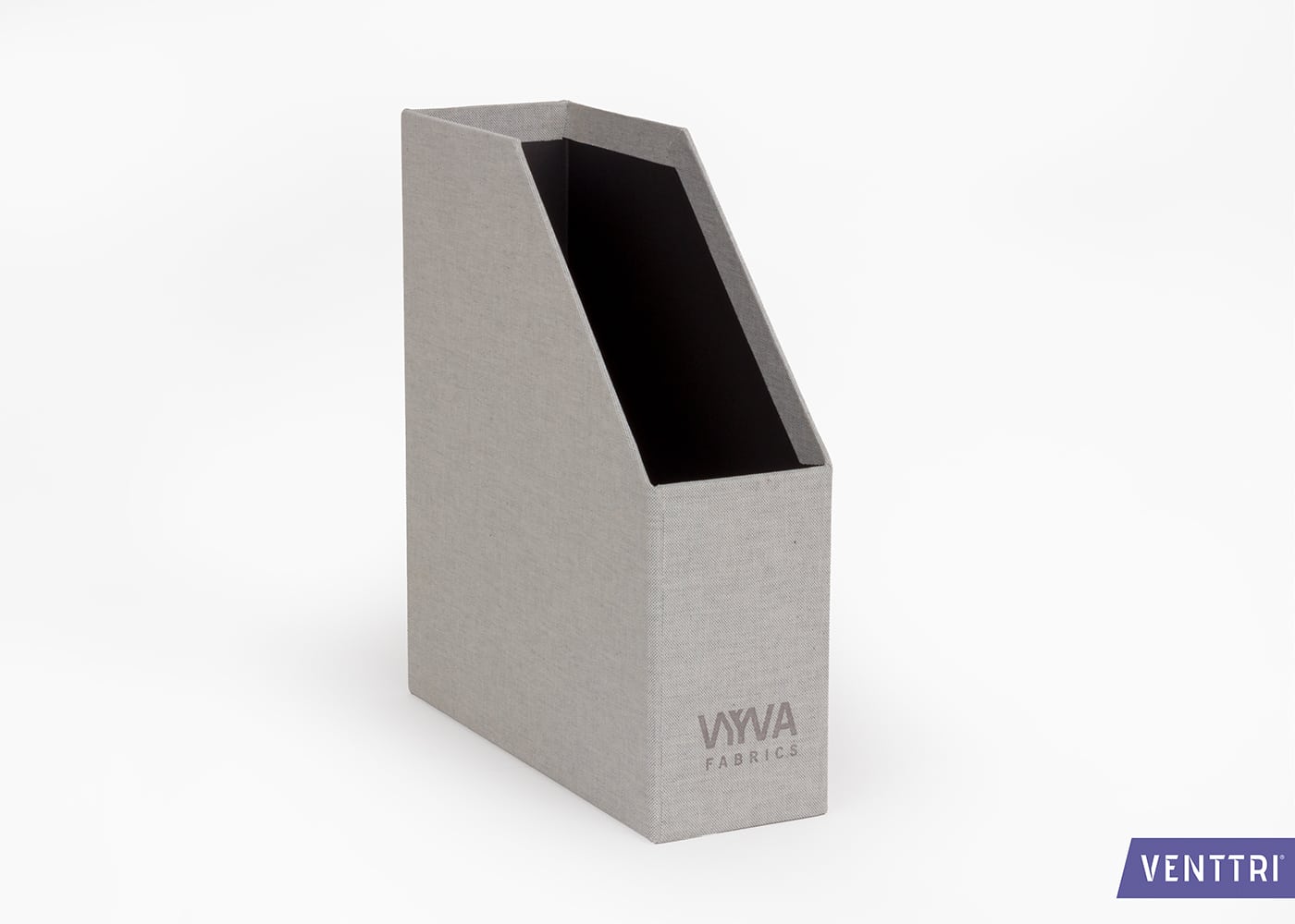 Für Vyva Fabrics haben wir einen robusten und stilvollen Ordnerhalter (auch als Schuber bezeichnet) realisiert. Die Basis besteht aus stabilem schwarzem Karton, der außen mit grobem Leinen bezogen ist. Die Innenseite ist sauber in Schwarz ausgeführt, was einen ruhigen und luxuriösen Eindruck vermittelt.